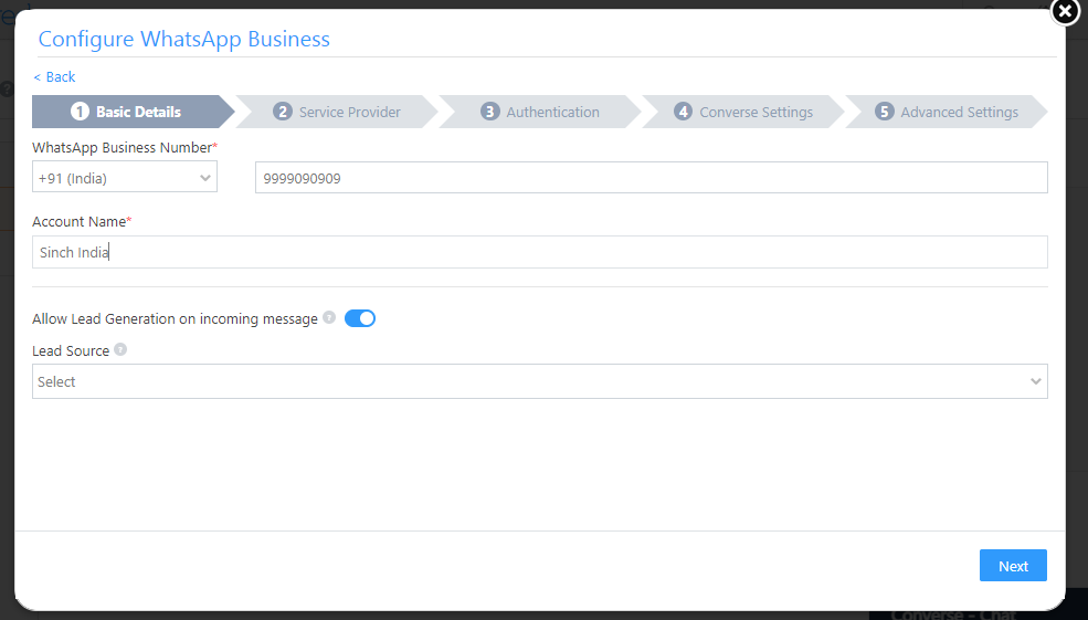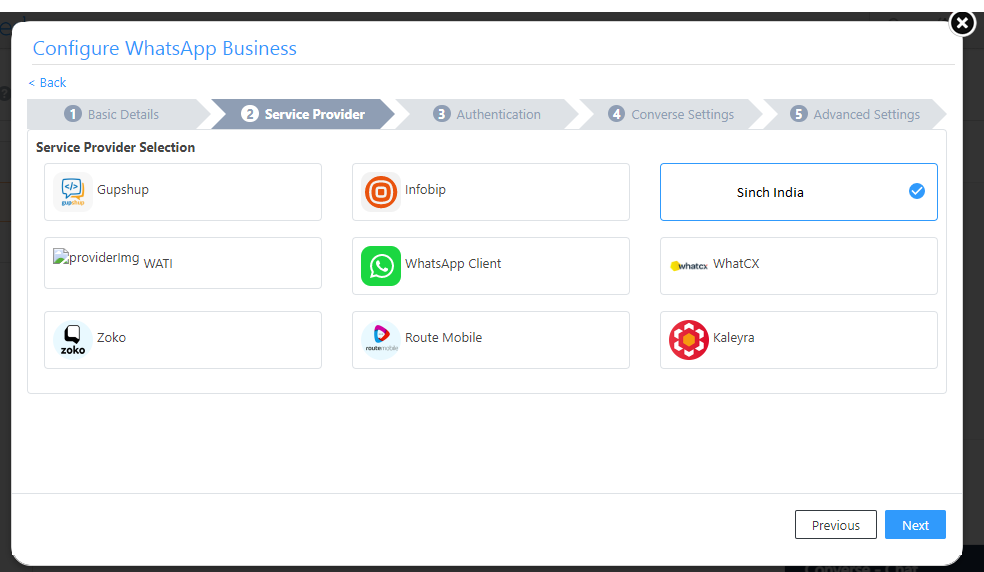 - After adding the above details, click on ‘Next’ button and select ‘Sinch India’ as the Service Provider and click on ‘Next’ button