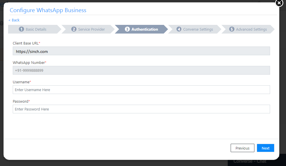 Authenticate the details of your service provider by Enter the username and password shared to you by Sinch India.