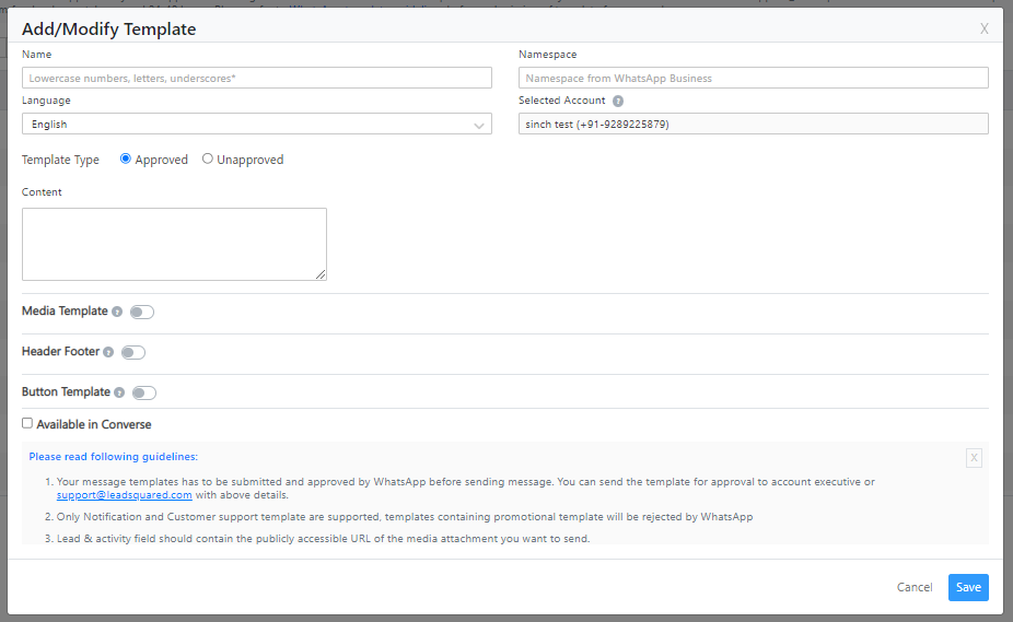 - Available in Converse - Converse is the Live Chat in LeadSquared. Check this section if you want the Template Message to appear in Converse.